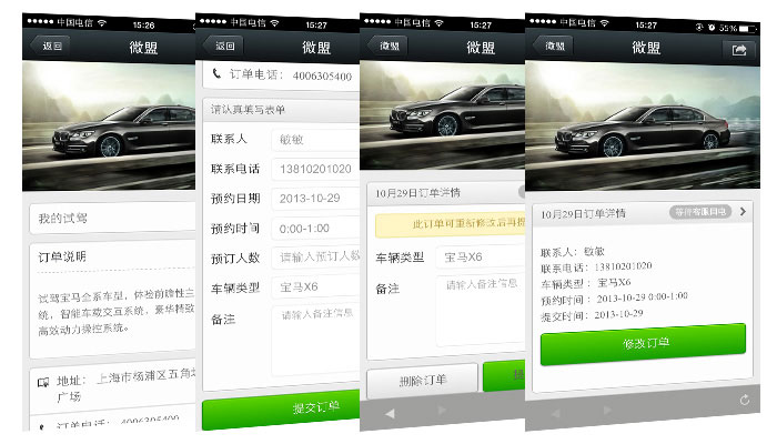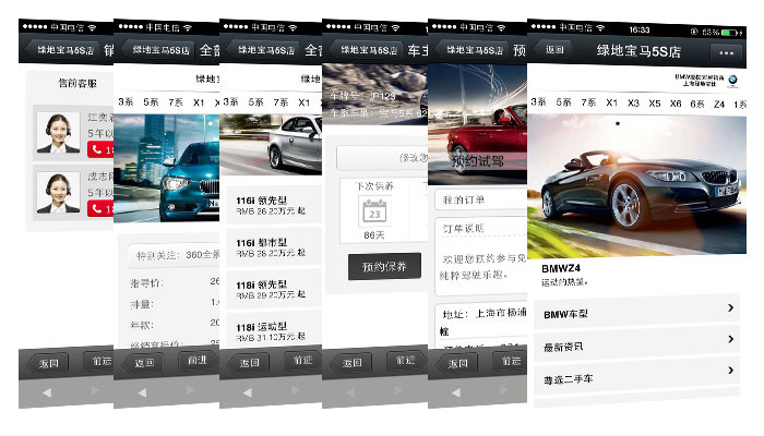 微汽车采用硕思微信通平台进行汽车的销售管理、预约保养、预约试驾、保险计算、车贷计算、车型比较、违章查询、360度全景看车、车主关怀等功能,整个过程非常便捷,省时省力省心,并通过与微盟平台有交互能力的手机客户端,快速便捷的实现了商家的销售管理与预约过程,同时也实现了客户无需进入4s店就能进行预约保养和试驾的功能。