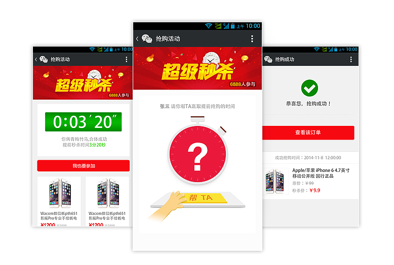 微信竞拍新方式,商家发布特价商品,粉丝选中商品之后通过邀请好友助力获得秒杀时间的增减,从而可以第一时间抢够商品。